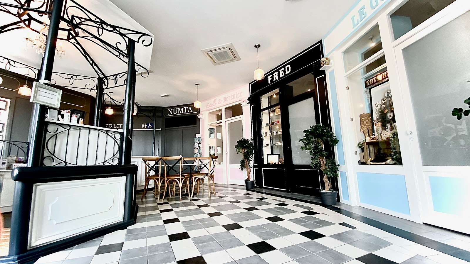 Ce salon lumineux à été pensé comme une ville au cœur de la ville. Un kiosque d'accueil entouré de ses commerces, chacun à l'image de l'artiste tatoueur qui l'occupe.